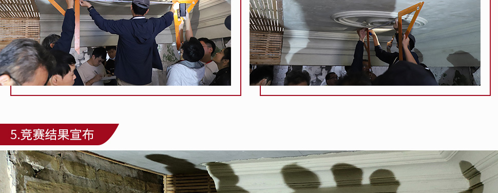 今年的競賽項目是以傳統工藝制作天花線腳和燈圈。賽程分為三天,難度大,時間緊。由于我們抽簽為11號,最后才輪到我們測量和繪圖,因此時間異常緊迫。測量完后自行準備模具、導軌,第二天再到現場在4小時內準備線腳、燈圈糙坯制作。第三天需要在4小時扯制線腳、燈圈,可謂是分秒必爭。